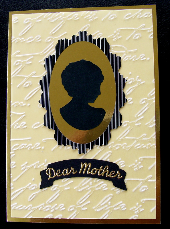 Have made a assortment of these silhouette Mother's Day cards using the Slice design cards. On this card I used a embossed script folder for background, silhouette(Think Pink) frame and banner(Vintage Findings) Slice design cards and gold peel sticker for sentiment.